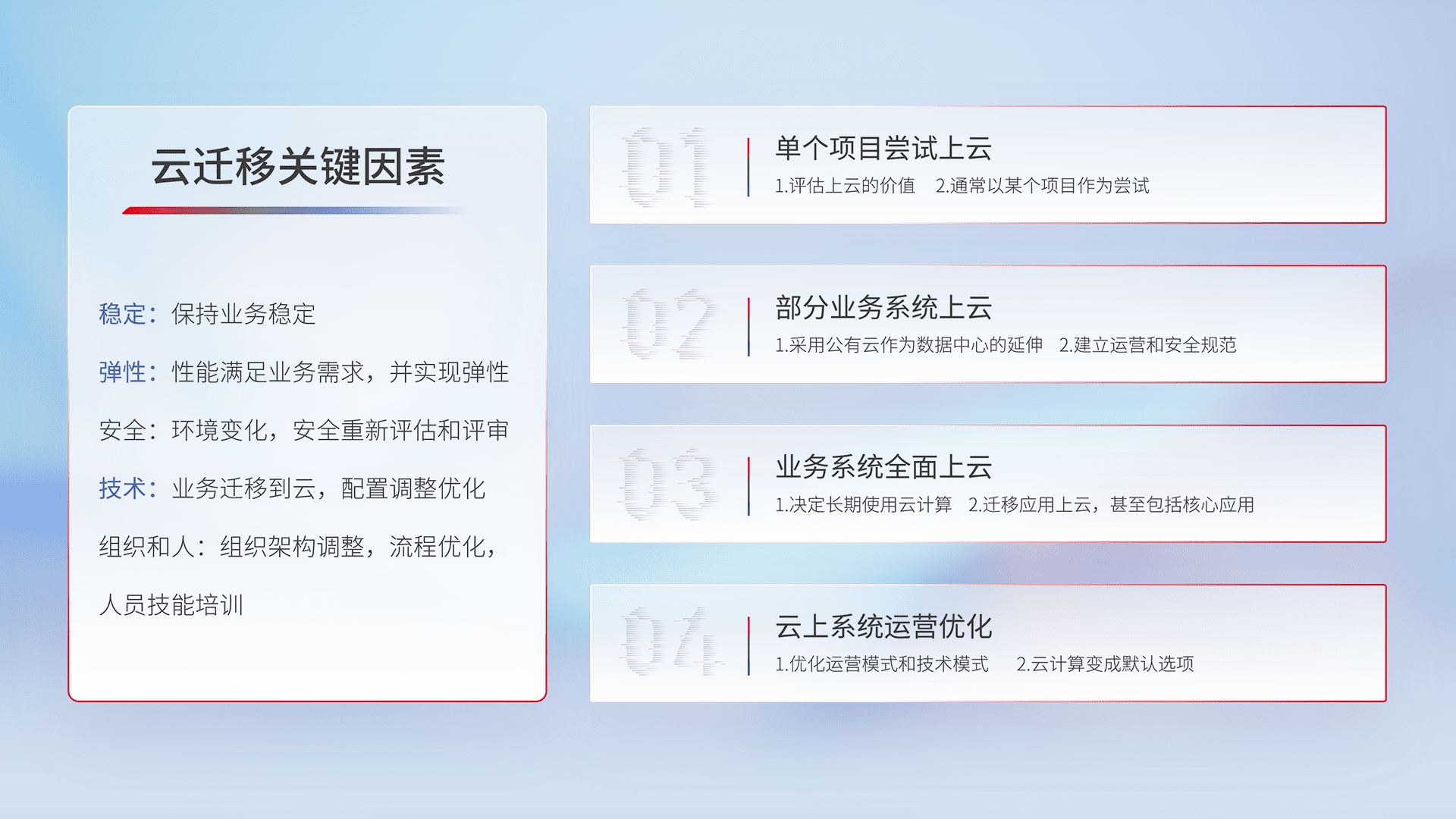 结合实际业务,,,,从规划设计、、、、云平台选型、、、、云原生改造、、、数据迁移、、、集成交付,,,,迁移全过程为客户识别最佳上云路径,,做好风险识别管理,,,,设计网络架构、、、、身份权限、、、安全审计合规、、操作审计、、、日志审计、、监控告警策略、、、、多站点容灾设计等,,,,对云上基础设施进行整体规划,,,,提升IT治理水平,,,,以满足弹性、、、高可用、、高性能的需求。。。