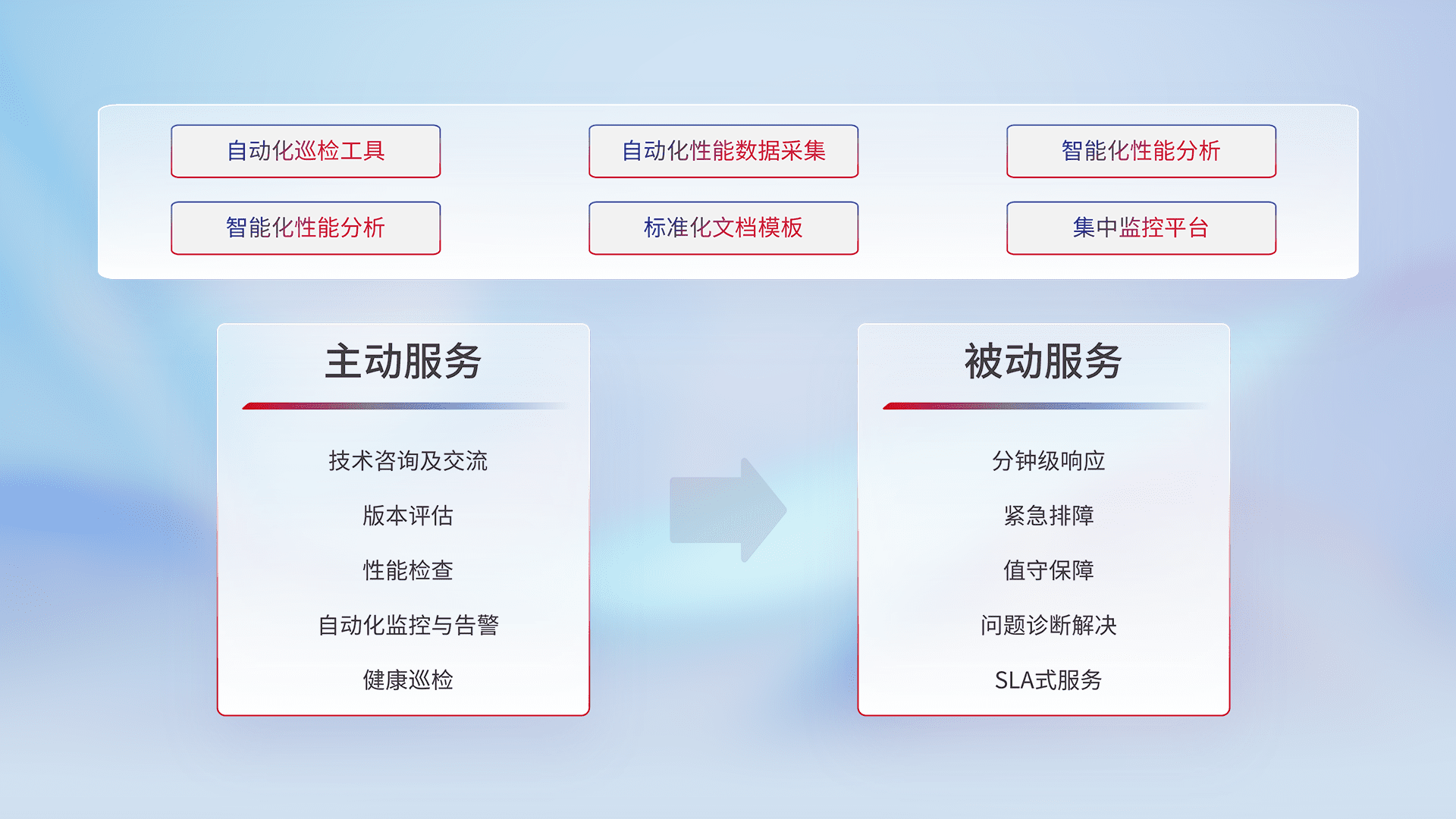 智能化工具和标准化文档,,,保障服务质量,,,提供主动服务(包含技术咨询、、、版本评估、、、性能检查、、、自动化监控与告警、、、健康巡检)和被动服务包含(分钟级响应、、、、紧急排障、、、、值守保障、、、问题诊断解决、、、、SLA服务)。。